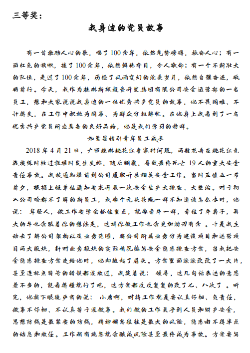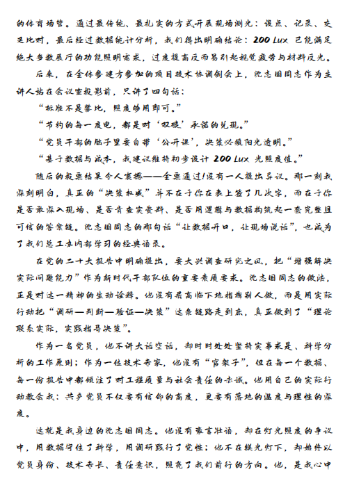 為確保比賽的專業(yè)性與公正性,集團(tuán)黨委聯(lián)合第三黨支部委員及群眾代表組成評審小組,從主題性、感染力、文字表達(dá)、創(chuàng)新性四個(gè)維度對作品進(jìn)行綜合評分。經(jīng)過層層篩選,最終評選出一等獎2名、二等獎1名、三等獎3名、優(yōu)秀獎5名。獲獎作品既有對黨員先進(jìn)事跡的深度刻畫,也有對黨性精神的深刻詮釋,充分反映了參賽者的真情實(shí)感與創(chuàng)作水平。